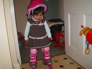エリカの方が運動神経がいいのよ、すぐにマスターして、ひとりでカーペットの上を歩ける。 でもね、、、そうじゃないのよね、手を持ってあげてビューンとしてあげるともっと大喜び。ローラースケートの遊び方を心得てる。